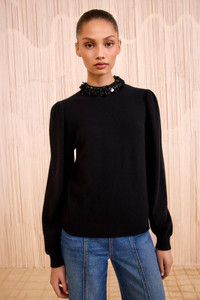 The Kalani Pullover is knitted from impeccably soft cashmere, ornamented with embroidered beads and paillettes along the neckline. This black sweater has gentle volume in the sleeves and brings playful definition to your cold-weather wardrobe. - Cashmere knit - Model Height: 5'10" - Designed for a relaxed fit - Long sleeves - Pullover style - Composition: 100% cashmere - Dry clean only