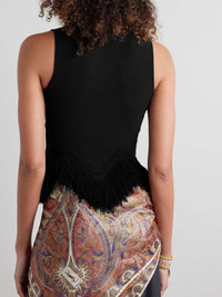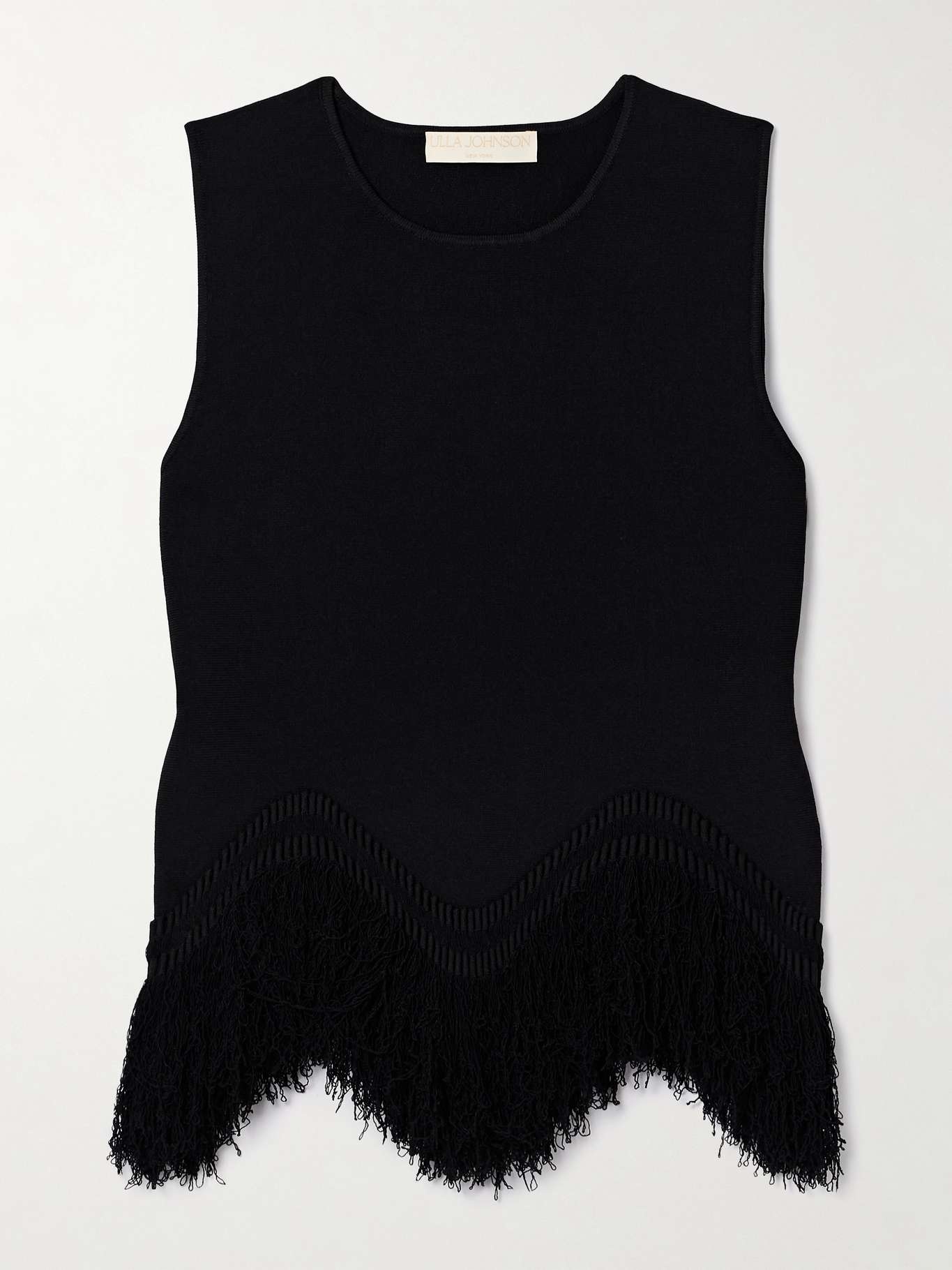 EDITORS'NOTES Ulla Johnson's 'Koa' top is adorned with fluffy, hand-cut fringe that creates a scalloped hem. It's knitted for a slim fit and blended with a hint of stretch for comfort. Wear yours with a mid-rise bottom to show off small peeks of skin. SIZE & FIT Model measurements: - Fits true to size, take your normal size - Designed for a close fit - Mid-weight knit - Model is 175cm/ 5'9" and is wearing a size XSmall - Bust: 81cm/ 32" - Waist: 65cm/ 26" - Hip: 90cm/ 35" DETAILS & CARE - Black viscose and polyester-blend - Slips on - 83% viscose, 17% polyester - Dry clean