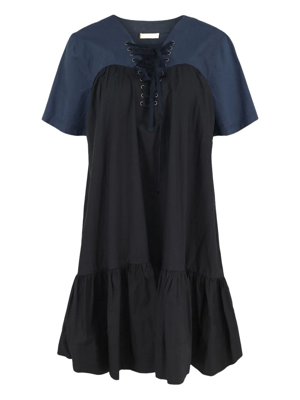 lace-up panelled mini dress Highlights - Navy blue - Lace-up neckline - Short sleeves - Tiered hem - Relaxed silhouette Imported Composition Linen/Flax 100% Washing instructions Read Manufacturer Guidelines