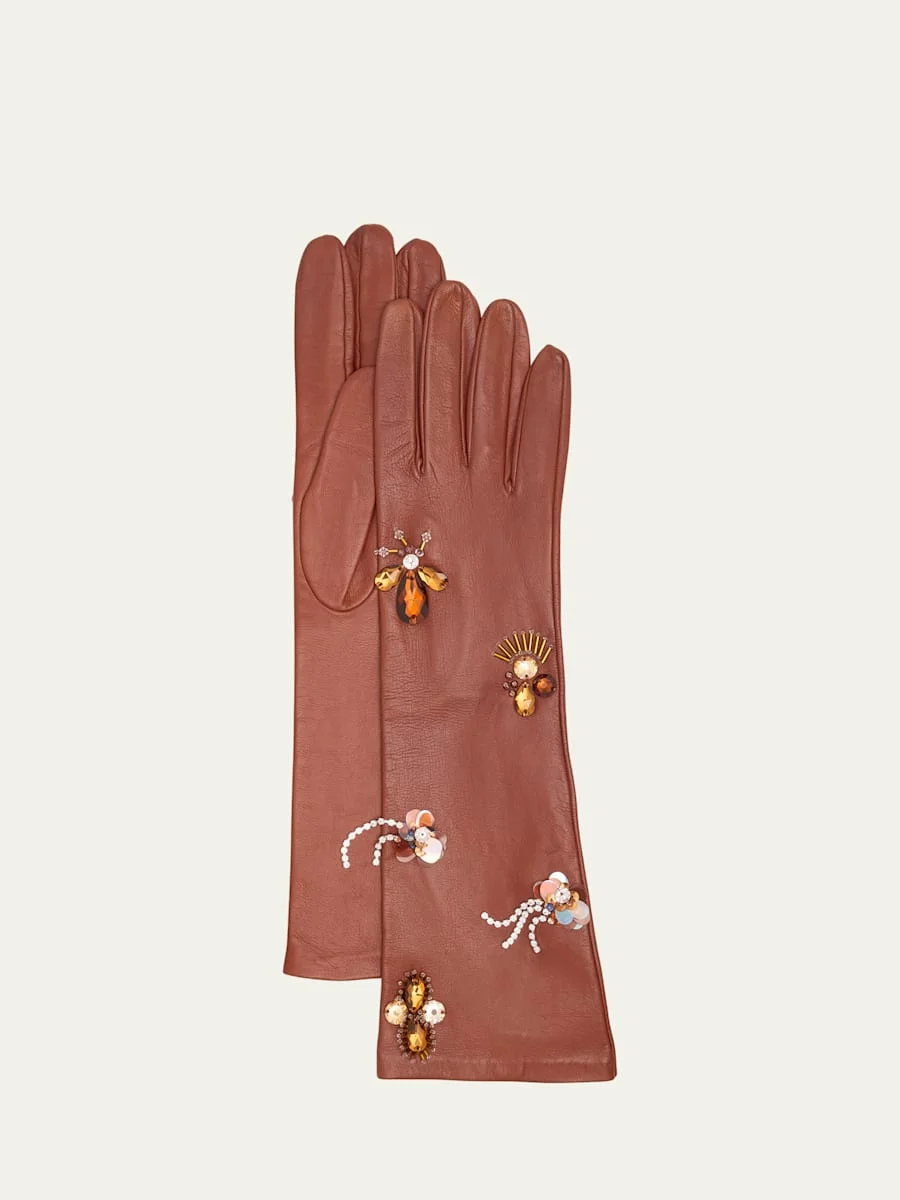 Ulla Johnson "Laetitia" longline leather gloves feature colorful beadwork and crystal embellishments with a floral and insect motif One size fits most Leather Imported