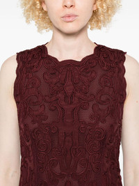 macrame pleated dress Highlights - Burgundy - Macrame bodice - Sleeveless - Pleated skirt - Round neck - Scalloped hem Imported Composition Polyester 100%, Silk 100% SIZE & FIT Model measurements Height 5 ft 9 in(1.75 m) Bust/Chest 34.64 in(88 cm) Hips 36.61 in(93 cm) Waist 26.37 in(67 cm) Washing instructions Read Manufacturer Guidelines
