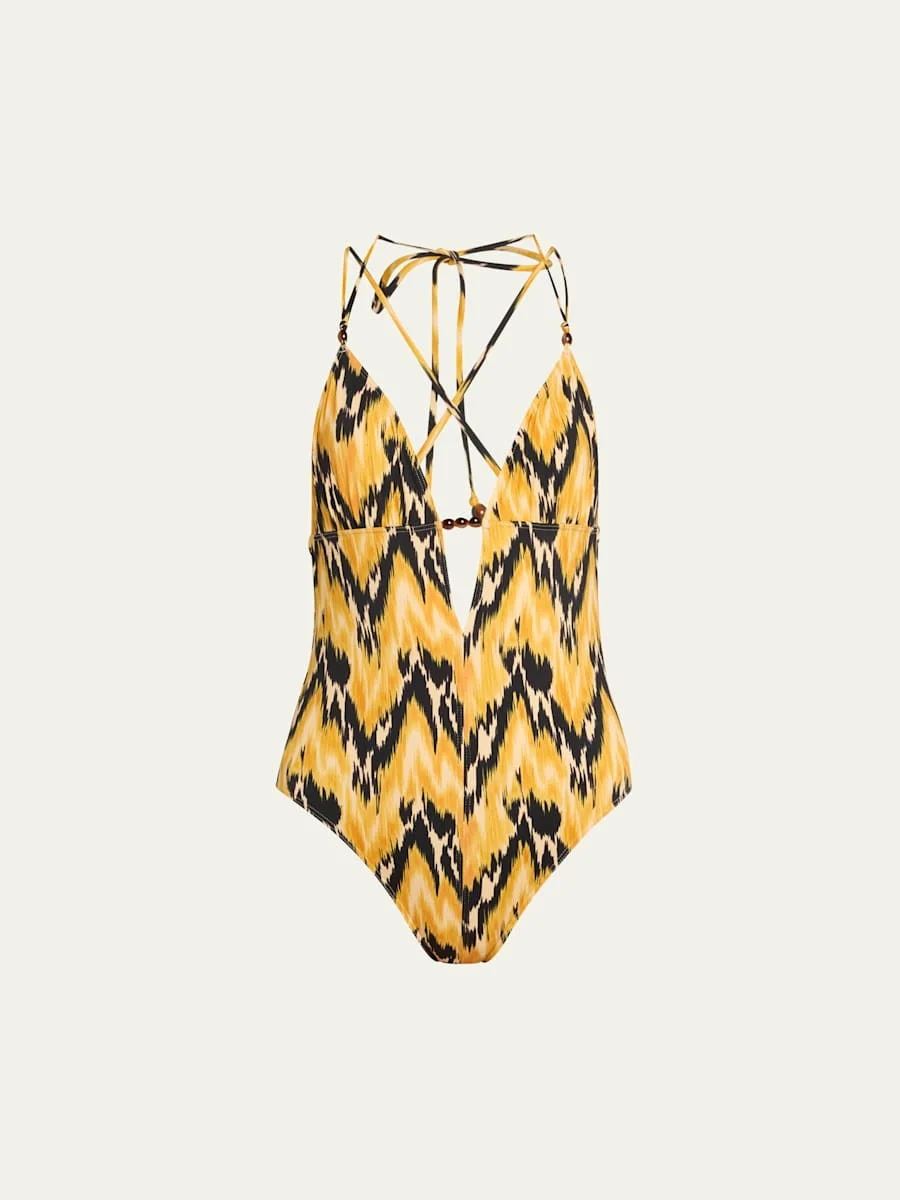 Ulla Johnson "Leila" one-piece swimsuit finished with beaded strap detailing V neckline balances figure Self-ties behind the neck Moderate seat coverage Nylon/polyamide/elastane/plastic Made in Portugal Online Inquiries: BGS21_T6NGX| Store Inquiries: #5021030