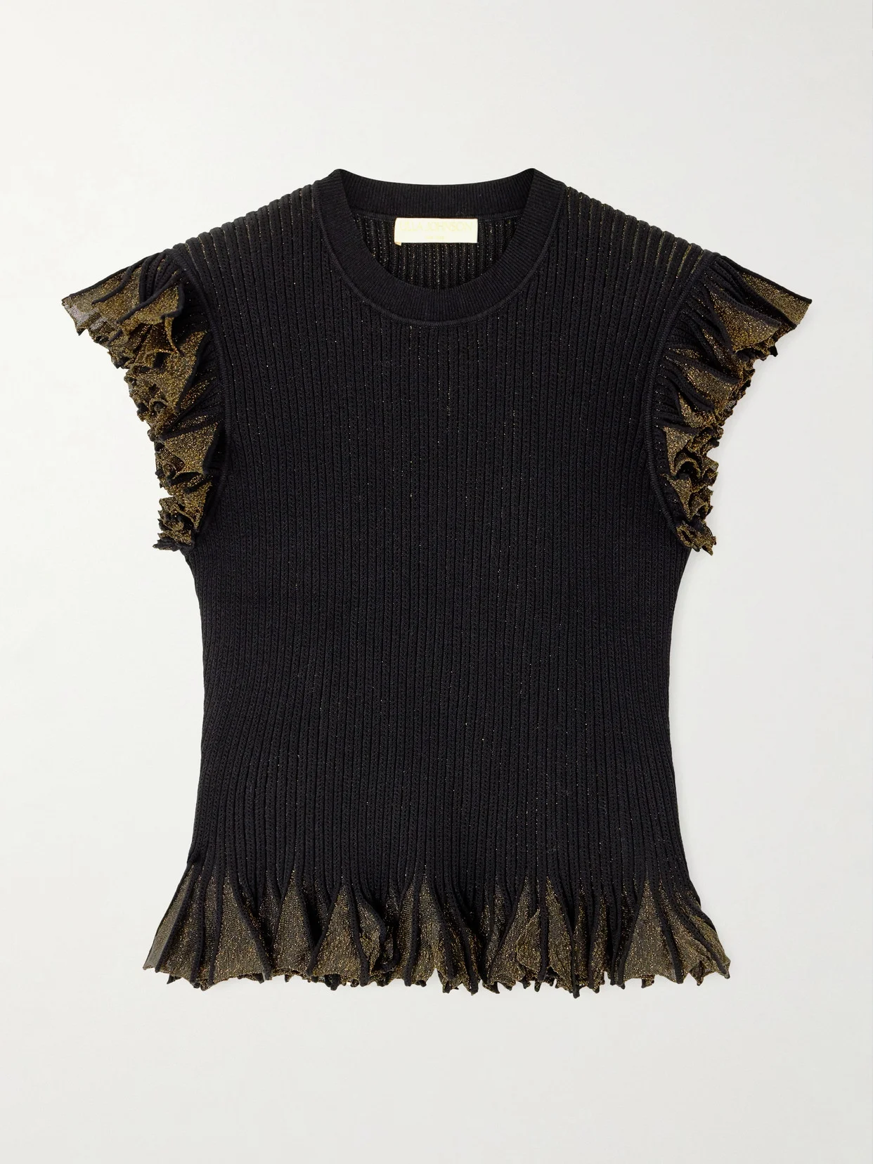 Ulla Johnson's 'Leila' top is made from ribbed-knit flecked with shimmering gold threads. It's designed for a close fit and has ruffled armholes.