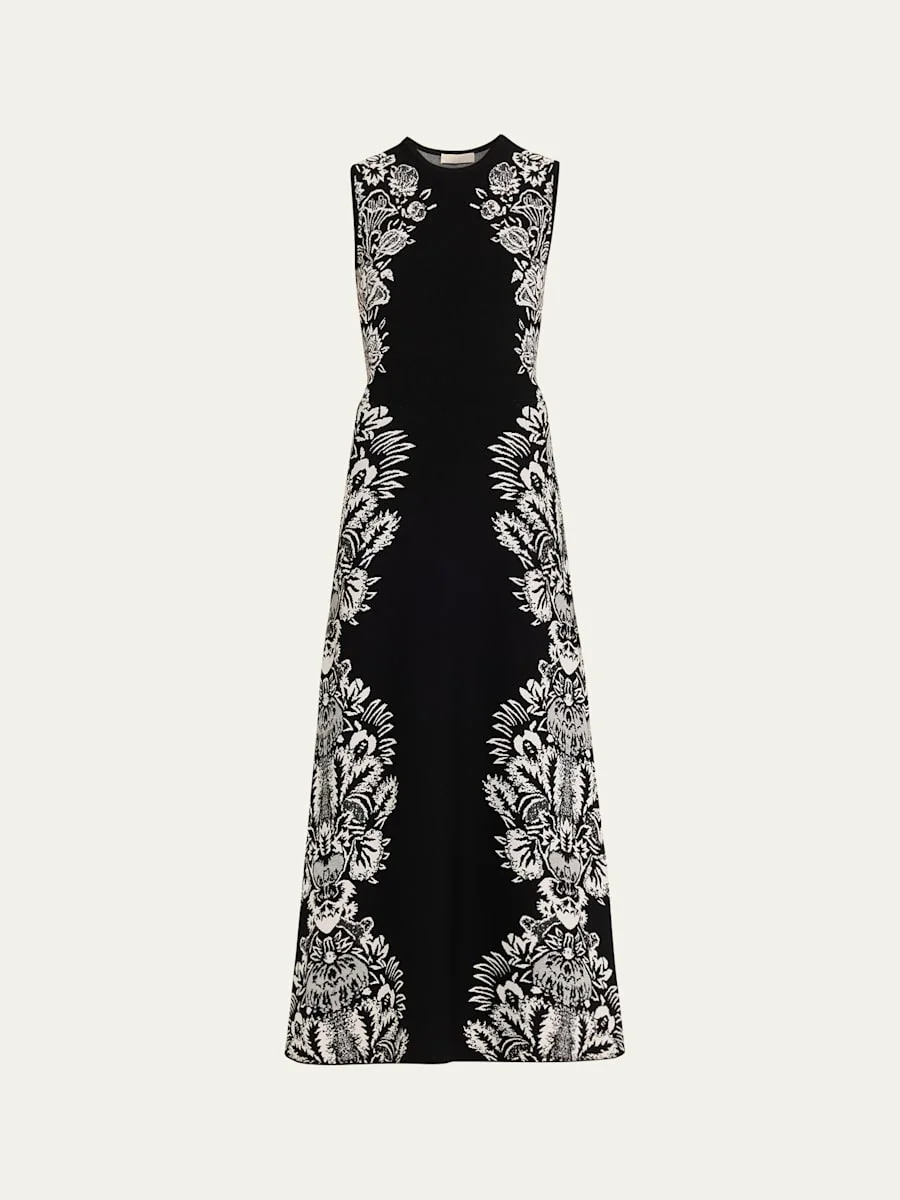 Featuring a contrast botanical print that frames the silhouette, the "Liana" dress by Ulla Johnson is crafted in stretch jacquard knit for endless comfort. Crew neckline Sleeveless Slim, Aline silhouette Full length Slipover style Viscose/polyester Dry clean Imported