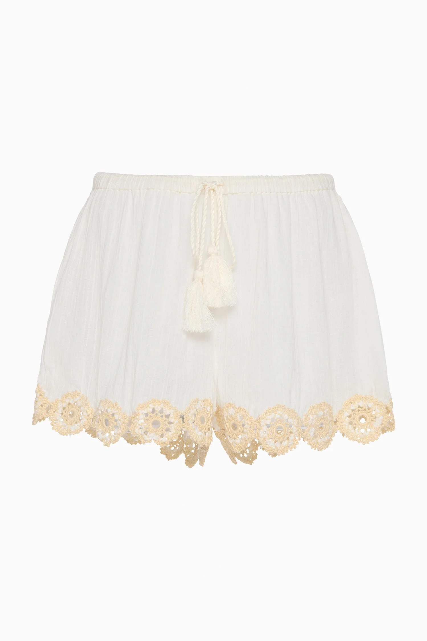 Crafted from ethereal white gauze, the Liya Short is a suitcase-ready style with delicate hand-crocheted trims at the hem for an artisanal touch. It is elasticated at the waist for comfort. - Cotton gauze - Model Height: 5'11" - Slight low rise - Elastic waist with tasseled ties - Pull-on style - Composition: 100% cotton - Hand wash cold - Style# SP261727