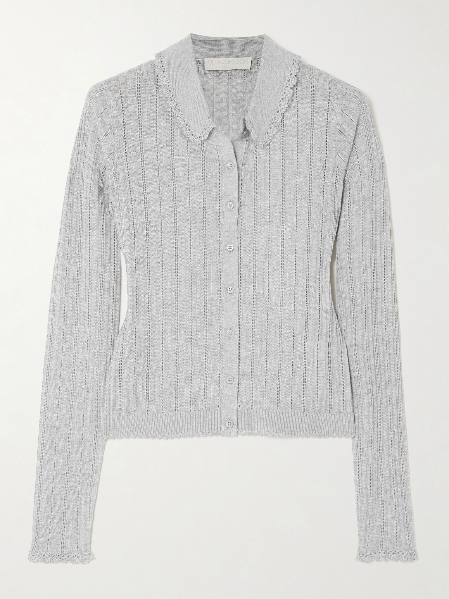 Ulla Johnson's 'Lottie' cardigan can be worn buttoned to the crochet-trimmed collar or left open, revealing a tank underneath - shop our edit if you plan on styling it like the latter. It's pointelle-knitted and has a close fit. Size & Fit - Fits true to size, take your normal size - Designed for a close fit - Lightweight knit - Model is 177cm/ 5'10" and is wearing a size Small Model measurements: - Bust: 85cm/ 33” - Waist: 66cm/ 26” - Hip: 92cm/ 36” Details & Care - Gray pointelle-knit and crochet - Button fastenings through front - 100% rayon - Dry clean