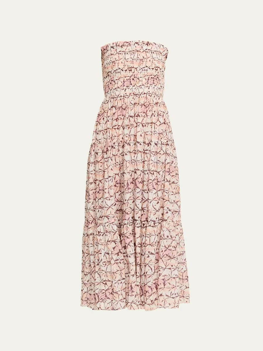 Ulla Johnson's "Luca" coverup dress features a geometric print and a smocked bodice Strapless neckline Sleeveless Hem falls below the knee Slipover style Nylon/polyamide/elastane Made in Portugal SIZE amp; FITModel measurements: 5'10" tall Model is wearing a US size 4/Small
