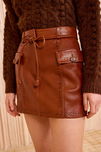 A modern take on the classic leather mini, the Luna Skirt is adorned with precision-cut perforations along the border and has distinctive pockets and a belt that fastens into a bow. The rich brown hue ensures elegance that endures. - Italian leather - Model Height: 5'11" - Mini length, fixed mid-rise waist - Removable tie belt - Buttoned front pockets - Fully lined - Concealed front hook and zipper - Composition: 100% lambskin leather - Dry clean only by leather specialist