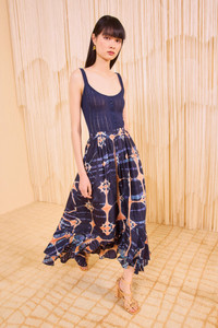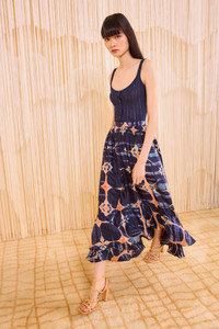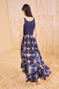 Crafted from a lightweight silk habotai, the Mae Skirt is skillfully hand-dyed by our artisan partners in Bangalore with a geometric shibori print unique to each silhouette. Perfect for day-to-night, habotai, this multicolored skirt is imbued with poetic movement, cascading to a high-low hemline with layered ruffles. This midi skirt fastens with a concealed side zipper. Due to the hand-dyed nature of this garment, each is uniquely beautiful and one-of-a-kind. Composition: 100% Silk Size & Fit - Model Height: 5'9"