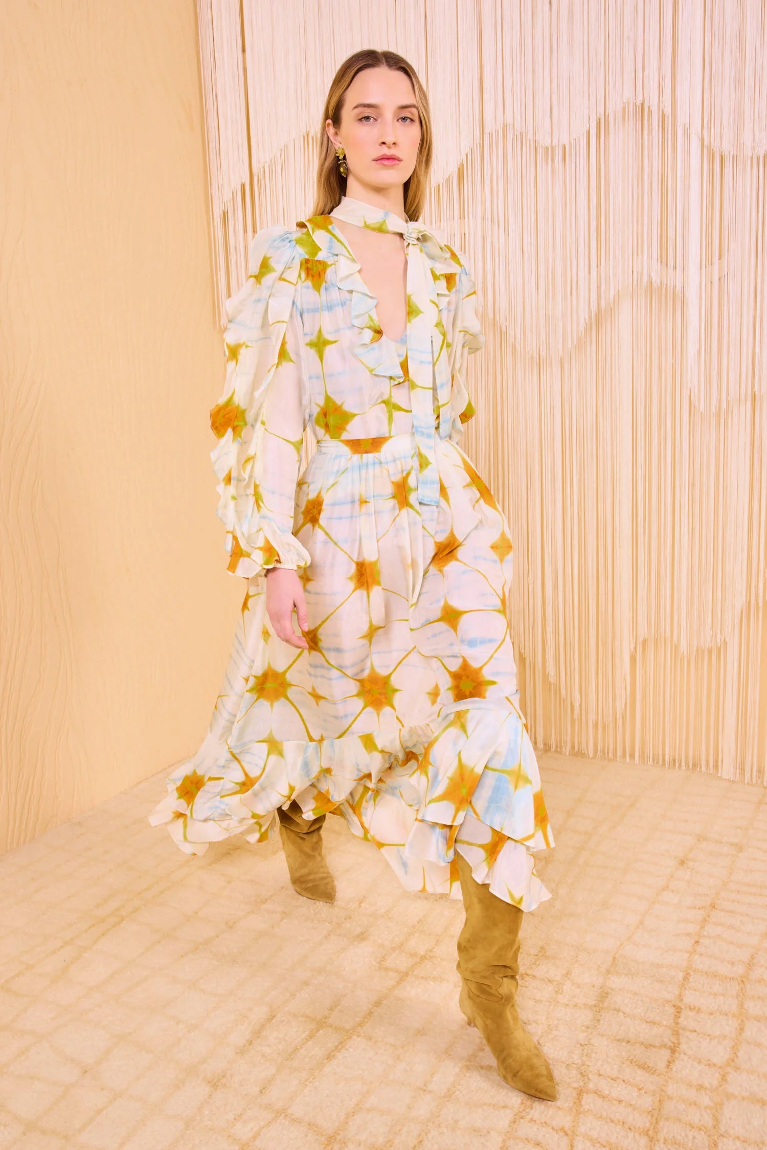 Crafted from a lightweight silk habotai, the Mae Skirt is skillfully hand-dyed by our artisan partners in Bangalore with a geometric shibori print unique to each silhouette. Perfect for day-to-night, habotai, this multicolored skirt is imbued with poetic movement, cascading to a high-low hemline with layered ruffles. This midi skirt fastens with a concealed side zipper. Due to the hand-dyed nature of this garment, each is uniquely beautiful and one-of-a-kind. Composition: 100% Silk Size & Fit - Model Height: 5'11"