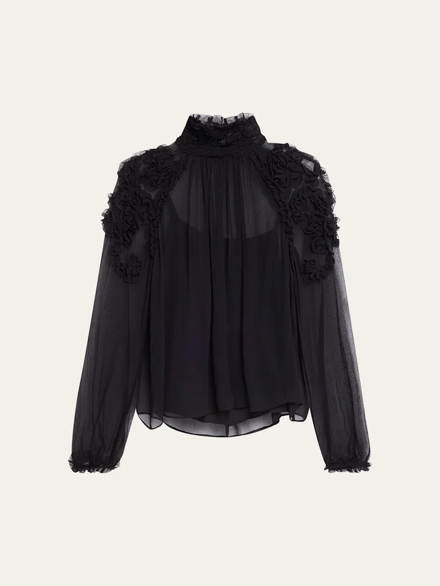 Ulla Johnson "Magdalena" luxurious silk blouse elevated with smocking and ruffles Turtleneck Long raglan sleeves Classic fit Hem falls to the hip Pullover style Silk Dry clean Imported Online Inquiries: BGS21_T6YS5| Store Inquiries: #5060434
