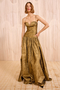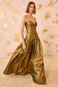 The Manet Gown is finely crafted from metallic taffeta—a featherlight fabrication that stretches and has a distinctive, crinkled surface that won’t fade over time. This gold gown is sculpted with a sweetheart neckline and is gathered at the bust into tiers that define the form. The floor-length hem whispers with soft movement. - Metallic foil taffeta - Model Height: 5'11" - Designed to fit close in the bodice, loose at hip - Sleeveless gown, dropped waist - Sleeveless - Lined in bodice; underwire cups - Concealed back zipper - Composition: 48% metallized polyester, 39% polyamide, 13% spandex - Dry clean only