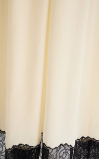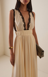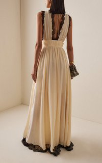 PRODUCT DETAILS - Slim fit, embroidered throughout, lace leaver linings, with self-tie ribbon by the neckline, pleated and sinched by the waist, sheath silhouette gown - Side zip - Lined - Composition: 100% Silk - Color: ivory - Dry Clean Only - Pre-Fall '25