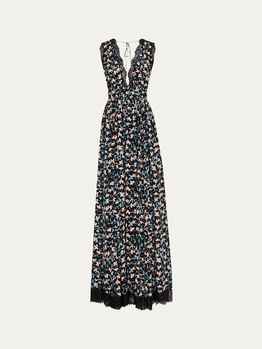 Ulla Johnson "Marguerite" floral-print silk gown finished with delicate lace trim V neckline Sleeveless A-line silhouette Full length Back tie closure Silk Dry clean Imported Online Inquiries: BGS21_T6UGY| Store Inquiries: #5021328