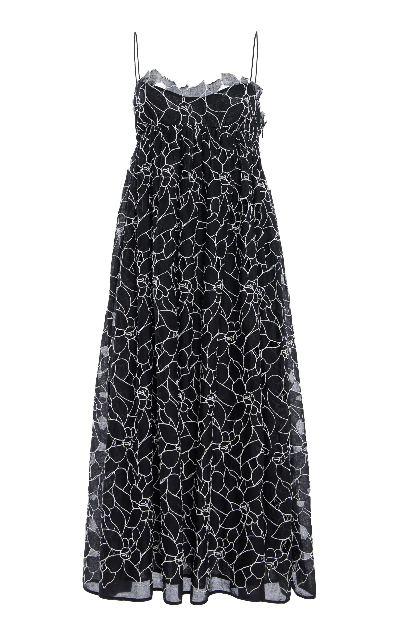 PRODUCT DETAILS - Slim fit, square neckline with petite straps, floral printed throughout, empire waist silhouette midi dress - Zip Fastening Through Back - Lined - Composition: 100% Cotton - Color: black - Dry Clean Only - Pre-Fall '25