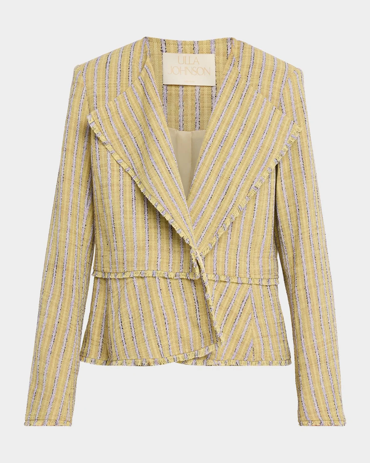 Ulla Johnson "Matteo" jacket crafted from & nbsp;Italian striped tailoring and finished with delicate eyelash fringe Wide shawl collar Long sleeves Tailored fit Hem sits at the hip Hidden front closure & nbsp; Cotton/viscose/polyester Dry clean only & nbsp; Imported