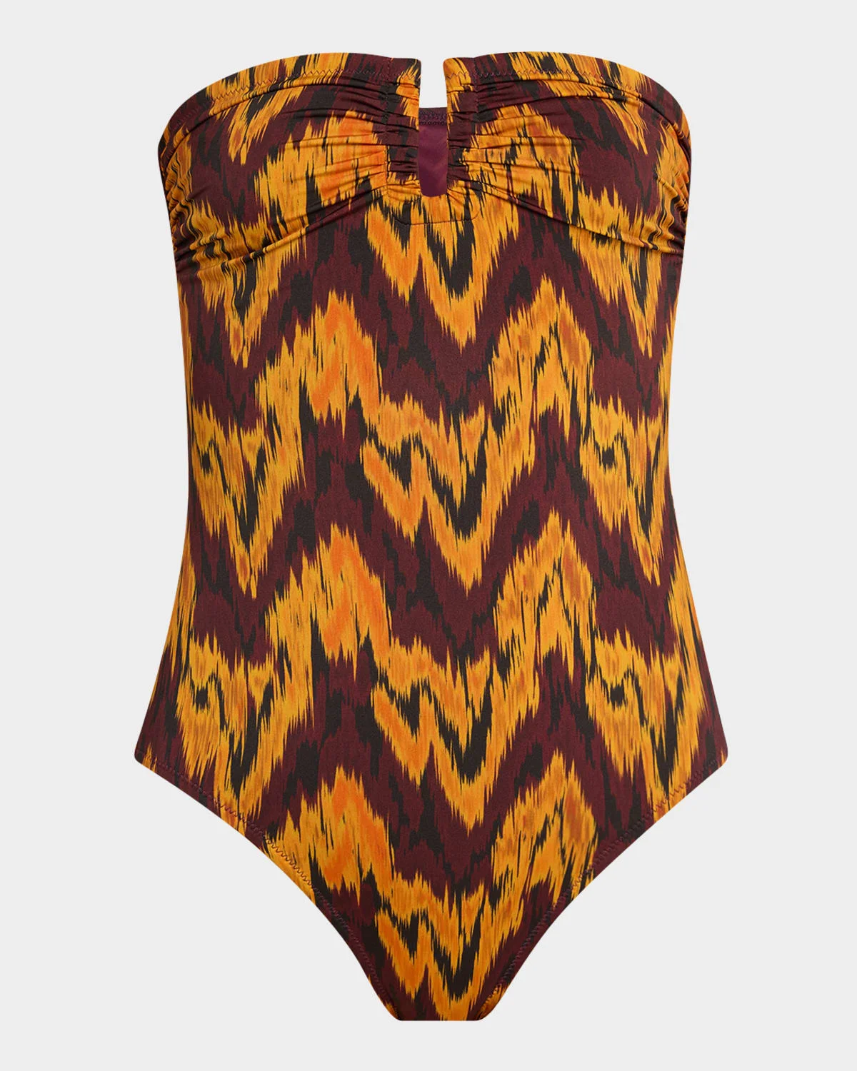 - Ulla Johnson "Monterey" bandeau one-piece swimsuit in an abstract chevron design with central U-ring hardware - Strapless neckline - Moderate seat coverage - Nylon/polyamide/elastane - Lining: Elastane/nylon - Do not iron, hand wash - Made in Portugal