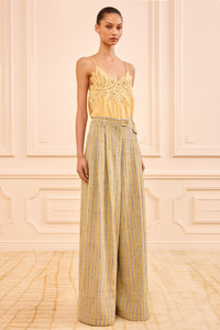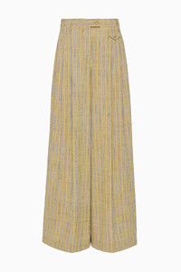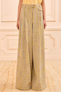Appearing in Look 12 on the SS26 Runway, the Motherwell Trouser is an exaggerated silhouette crafted from Italian striped suiting with a richly textured surface reminiscent of a painter’s canvas. This green and gray pant is elegantly pleated for subtle definition, while the front coin-flap pocket adds a vintage touch. - Italian striped tailoring - Model Height: 5'10" - Mid-rise, wide leg - Coin flap front pocket - Side and back pockets - Concealed front hook, button, and zipper - Composition: 37% cotton, 36% viscose, 14% polyester, 13% linen - Delicate dry clean - Style# SP260408
