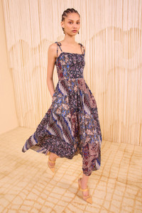 The Naaila Dress summons easy elegance with delicate shoulder ties and a refined midi silhouette. Crafted from soft cotton and silk, this multicolored sleeveless dress is enlivened by our intricate batik print and is trimmed with delicate ruffles at the neckline. It has convenient pockets at the side. Composition: 35% Silk, 65% Cotton Size & Fit - Model Height: 5'9"
