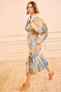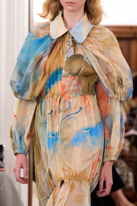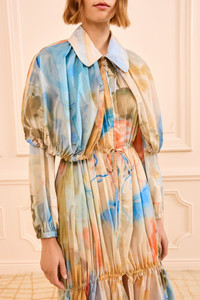 Making a soft statement in Look 32 on the SS26 Runway, the Nadia Coat is printed with gestural, abstract imagery from Helen Frankenthaler’s 1957 painting “Western Dream.” Reimagining the artist’s brushstrokes on a translucent nylon base, this multicolored coat has a cape and softly gathered adjustable tiers on and body, balancing femininity with utilitarian ease. - Translucent nylon - Model Height: 5'10" - Designed for a relaxed fit - Adjustable drawstring at cape hem - Adjustable drawstring waist - Side pockets - Internal adjustable drawstring at mid-thigh and hem - Two-way zipper through front - Composition: 100% nylon - Dry clean only - Style# SP261208 - This item is part of our collaboration with the Helen Frankenthaler Foundation.