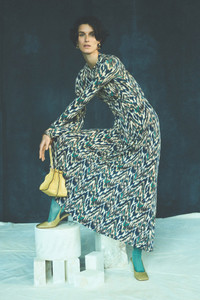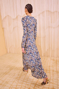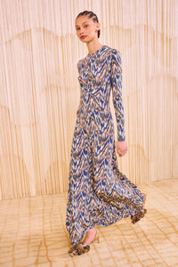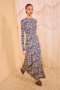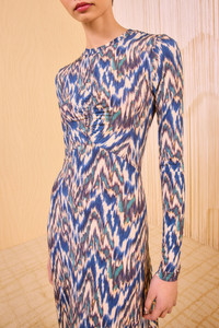 The Naia Dress embodies easy elegance, with a sleek, long-sleeve profile with ruching at the front to complement the form. Spun from featherlight tricot jersey, it is adorned with our vintage-inspired ikat print with bold, undulating graphics that catch the eye. This multicolored maxi dress pulls over. Composition: 91% Rayon, 9% Elastane Size & Fit - Model Height: 5'10"