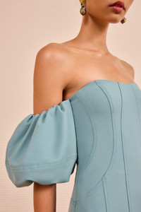 Tinged a delicate ocean blue, the Ninia Dress brings sculptural elegance to occasions with an off-shoulder neckline framed by dramatically puffed sleeves. Tailored from twill gabardine, it has a subtle sweetheart neckline and architectural seamlines that define the form. - Twill gabardine - Model Height: 5'10" - Designed to be fitted at the bust and waist, flared at skirt - Midi length - Off-the-shoulder neckline - Balloon short sleeves with elastic opening and cuffs - Side pockets - Internal corset at bodice for close fit - Concealed back zipper - Composition: 53% polyester, 43% virgin wool, 4% elastane - Dry clean only