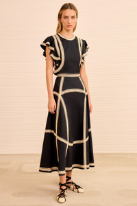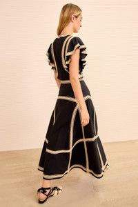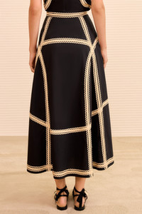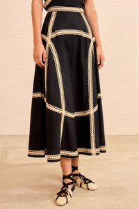 The Norah Skirt is made from signature water-washed poplin that’s re-envisioned with intricate ric-rac and grosgrain ribbons. Alive in texture and depth, this black skirt has a timeless A-line cut with graceful volume at the flared hem. - Water-washed cotton poplin - Model Height: 5'10" - Midi length, fixed high-rise waist - Concealed side zipper - Composition: 100% cotton; combo: 100% rayon - Dry clean only