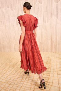 The Olga Dress catches the eye with degrade eyelets that undulate across signature water-washed poplin. Tinged a soft Claret red, it is adorned with lace inserts that subtly reveal and ruffled scalloping for added dimension. - Water-washed poplin - Model Height: 5'10" - Designed with a slightly loose bust, fixed waist, and is loose at hip. - Midi length - Short flutter sleeves - Concealed side zipper - Composition: 100% cotton - Machine wash cold