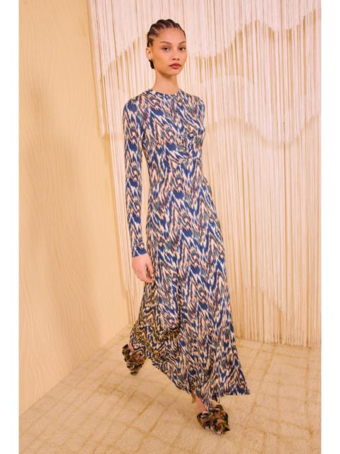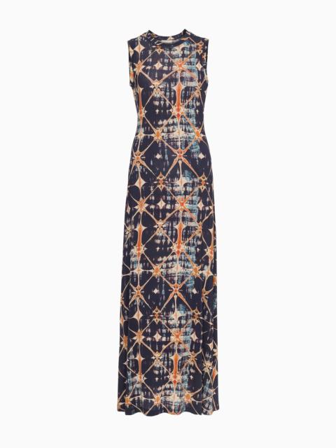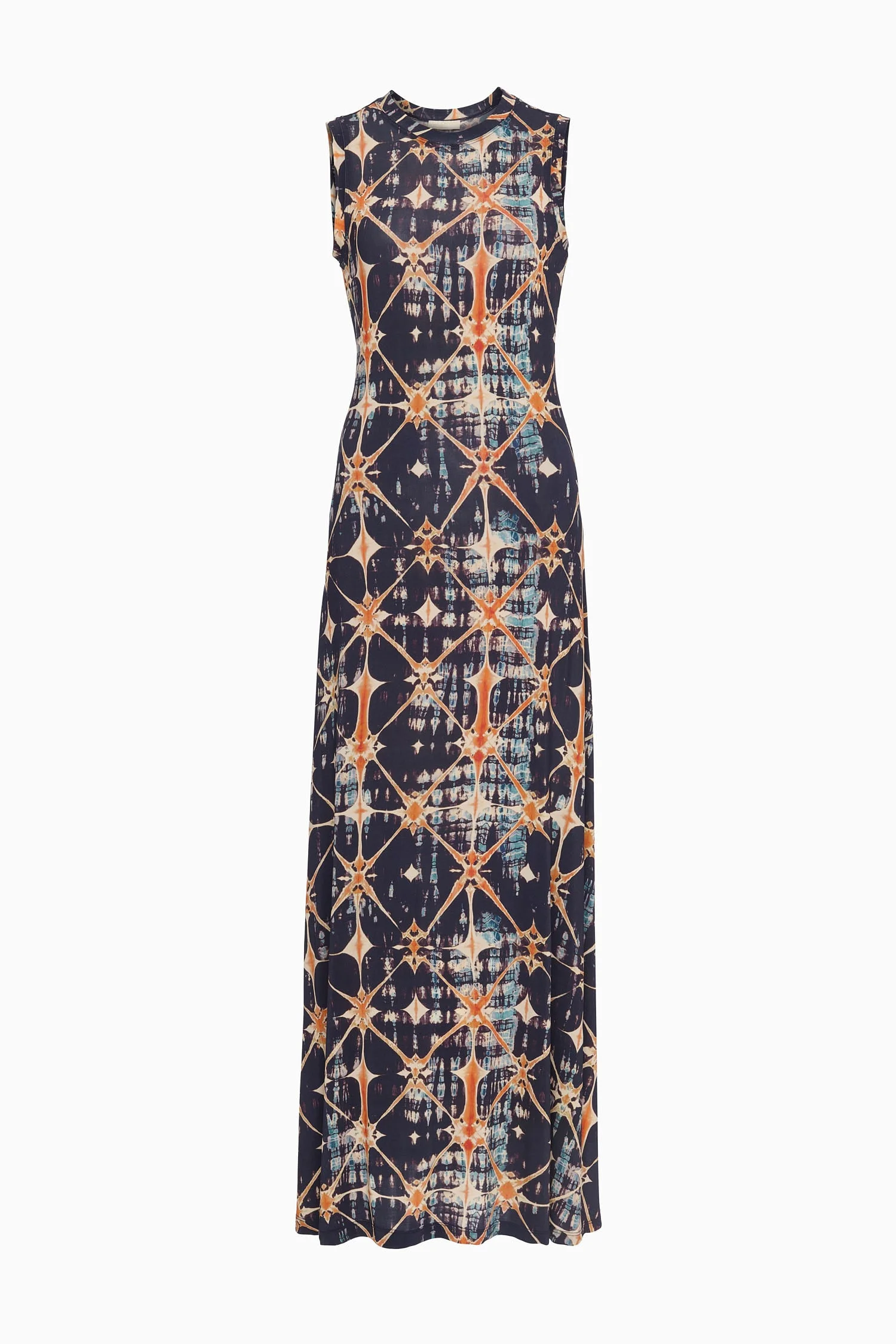 The Orla Dress is crafted from our tricot jersey adored for its soft and featherlight feel. This multicolored midi dress is saturated with geometric shibori textures in rich, earthen shades of blue and orange. Skimming the form, it has a crew neckline and is the perfect sleeveless dress to slip on for easy warm-weather days. Composition: 91% Rayon, 9% Elastane Size & Fit - Model Height: 5'10" - This midi dress is designed for a close fit and gently flares at the hem.