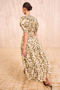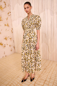 The Othella Dress is cut from crisp cotton poplin that’s saturated with intricately hued florals inspired by the beauty of burnout textiles. A signature Ulla Johnson silhouette, this multicolored dress is framed by artfully puffed sleeves and is finished with rouching at the neck and waist. - Cotton poplin - Model Height: 5'10" - Designed with an elastic waist and is loose at the bust and hip. - Midi length - Short sleeves with elastic cuffs - Side pockets - Zipper along front - Composition: 100% cotton - Machine wash cold