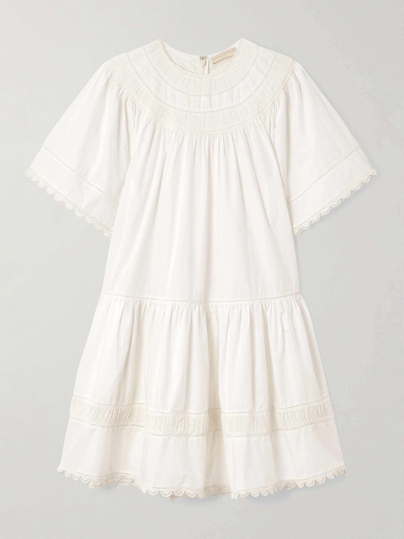Intricate details make Ulla Johnson's 'Oumi' mini dress feel so romantic. Cut from poplin in a tiered silhouette, it's traced with airy crochet and pleated chiffon trims. Wear yours with Mary Jane pumps. Size & Fit - Fits true to size, take your normal size - Designed for a relaxed fit - Lightweight, non-stretchy fabric - Model is 180cm/ 5'11" and is wearing a US 2 Model measurements: - Bust: 77cm/ 30.5" - Waist: 60cm/ 23.5" - Hip: 92cm/ 36" Details & Care - White poplin, crochet and chiffon - Concealed zip fastening along back - 100% rayon - Designer color: Cowrie