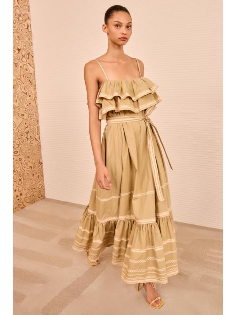The Palermo Dress is made from signature water-washed poplin that’s reinterpreted with ric-rac and grosgrain ribbons, adding striped texture and depth to the black silhouette. It has a form-celebrating fit with a plunging neckline and a full, gathered hem. - Water-washed cotton poplin - Model Height: 5'10" - Designed to be fitted at the bust and waist, loose at hip - Midi length - Sleeveless - Concealed side zipper - Composition: 100% cotton; combo: 100% rayon - Dry clean only