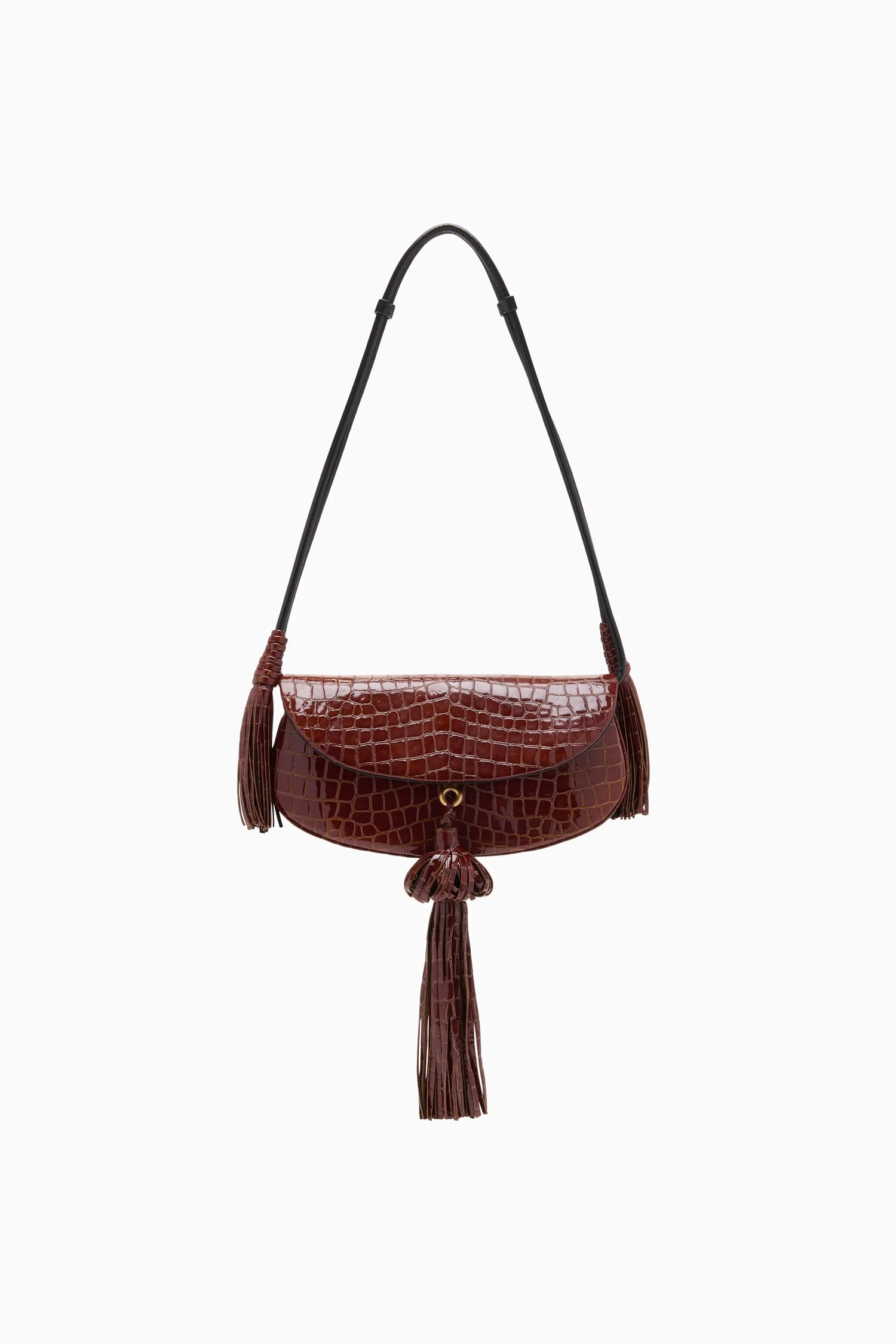 Debuting on the AW25 runway, the Paloma Bag is the newest addition to the Ulla Johnson handbag lineup, arriving in rich brown croc-embossed leather. This artful silhouette is adorned with hand-shaped tassels inspired by the organic beauty of botanicals, while the straps embody seamless functionality—adjust to wear as a shoulder bag, crossbody, or detach for an evening clutch. - Height: 5.7 in / Length: 9.8 in / Depth: 2.6 in - Handle drop: 5.5 in shortest, 14.6 in longest - Shiny calfskin leather - Made in Italy - Adjustable removable straps - Nappa leather lining - Antique brass hardware - Clasp closure Size & Fit Find your size with our .