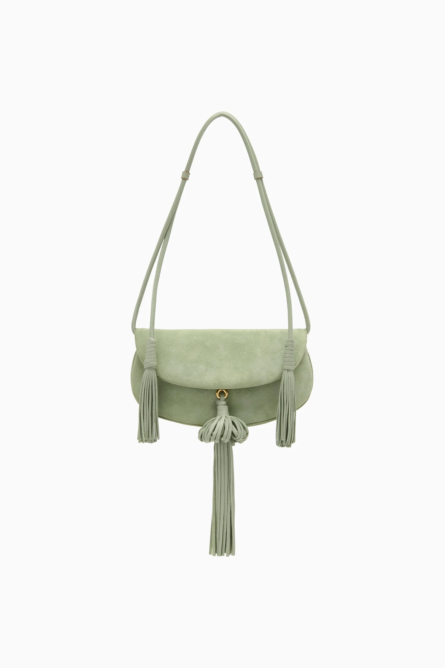 The Paloma Bag is the newest addition to the Ulla Johnson handbag lineup, arriving in suede in a serene shade of green. This artful silhouette is adorned with hand-shaped tassels inspired by the organic beauty of botanicals, while the straps embody seamless functionality—adjust to wear as a shoulder bag, crossbody, or detach for an evening clutch. - Height: 5.7 in, 144.7 mm / Length: 9.8 in, 248.9 mm / Depth: 2.6 in, 66 mm - Handle drop: 5.5 in, 139.7 mm shortest, 14.6 in, 370.8 mm longest - Suede - Made in Italy - Adjustable removable straps - Nappa leather lining - Antique brass hardware - Clasp closure Size & Fit Find your size with our .