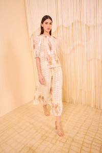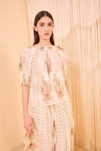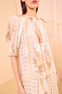 Crafted from airy chiffon jacquard, the Pippa Blouse is adorned with a floral scarf print uniquely layered atop tonal fil coupe botanicals. Effortless and flowy, this soft white style has a round neckline and is framed by puffed short sleeves with elastic cuffs that tie. It is unlined and fastens with a buttoned back keyhole. Composition: 64% Silk, 36% Viscose Size & Fit - Model Height: 5'10" - This blouse is designed for a loose fit.