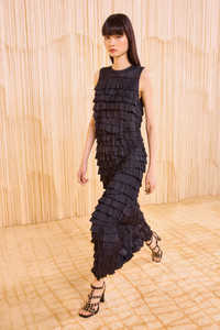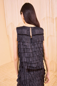 Crafted from plisse satin with a subtle sheen, the Quinn Top is constructed from tiers of crinkled ruffles that cascade beautifully. It has a sleeveless silhouette with a round neckline and is cut for an effortless fit with a simple button keyhole at the back. Coordinate this black top with our Eloise Skirt and gold jewelry for evenings out. Composition: 100% Polyester Size & Fit - Model Height: 5'9" - This top is designed for a slightly loose fit.
