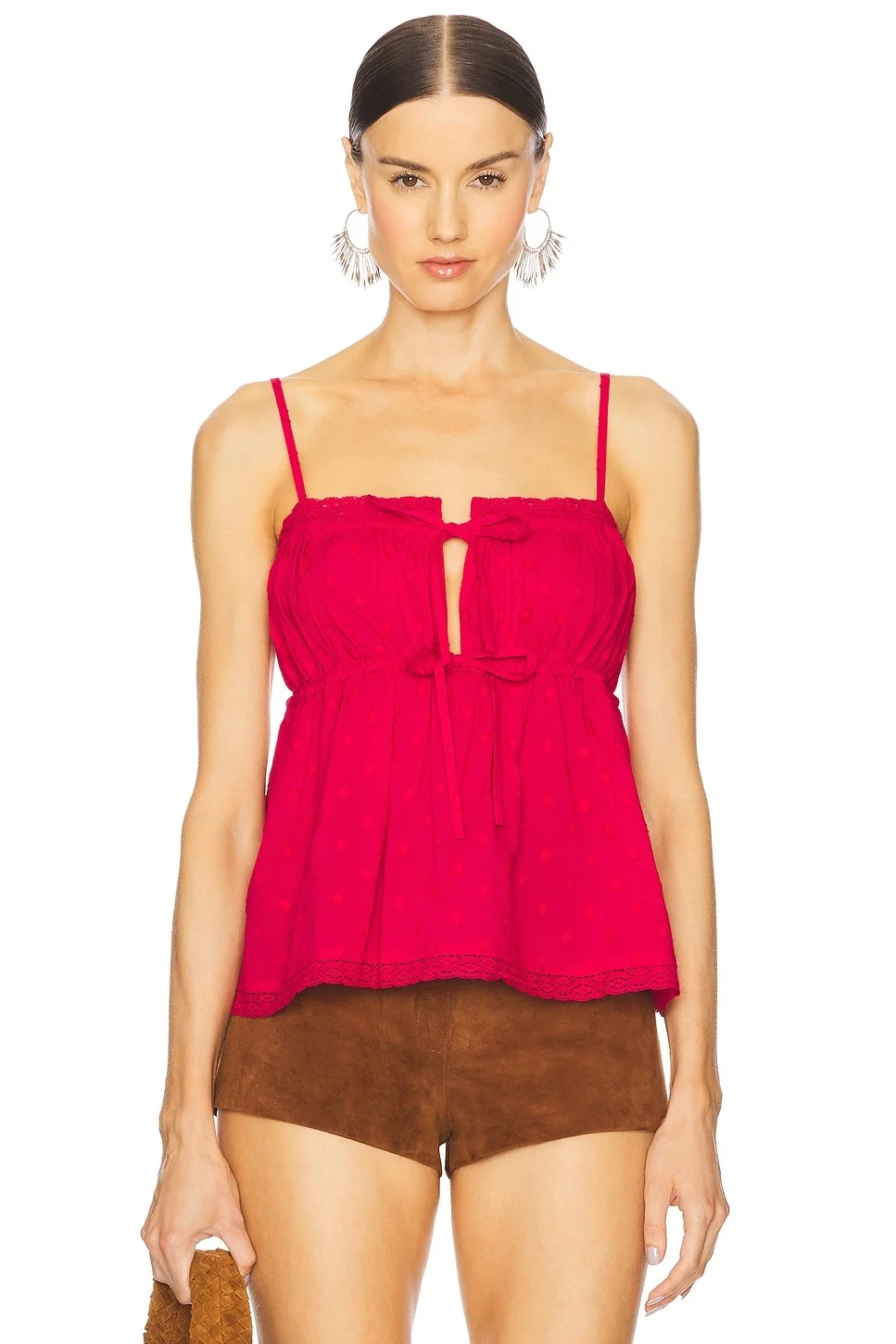 - 100% cotton - Machine wash cold - Front self-tie closure - Lace trim - Lightweight linen fabric with tonal embroidered polka dot design - Revolve Style No. ULLA-WS463 - Manufacturer Style No. SP250245