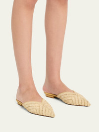 Ulla Johnson "Aunika" woven raffia ballerina mules with leather trim 0.25 in / 10 mm flat heel Pointed toe Easy slide style Leather outsole Lining: Goat leather Spot clean Made in Italy Online Inquiries: BGS21_X6XFH| Store Inquiries: #5021854