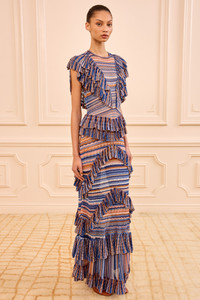 Look 51 on the SS26 Runway, the Raina Dress comes alive with ruffled tiers that create expressive movement. Crafted from a lace-inspired pointelle knit, this multicolored dress breathes with striped chevron and diamond motifs that bring dimension to the maxi silhouette. - Pointelle knit - Model Height: 5'10" - Designed for a slim fit - Maxi length - Crew neckline - Short sleeves - Pullover style - Composition: 100% rayon - Dry clean only - Style# SP260703
