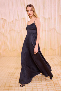 The Reine Gown is made from black plisse satin with a smooth, silken texture and subtle sheen. Beautifully pleated throughout, this event-ready dress is suspended from slender straps with elegant binding at the bodice and billowing, fluid volume at the floor-sweeping skirt. It fastens with a concealed back zipper. Designed with an open back. Has a fitted bust, fixed waist, and is loose at the hip. Composition: 100% Polyester Size & Fit - Model Height: 5'11" - This gown is designed with a fitted bust, fixed waist, and is loose at the hip.