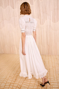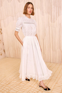 The Ren Skirt is crafted from white water-washed poplin enlivened by degrade eyelets that undulate across the silhouette. Designed to sit high on the waist, it unfurls to a full skirt trimmed with scalloping for added dimension. - Water-washed poplin - Model Height: 5'10" - Midi length, fixed high-rise waist - Side pockets - Cotton lining - Concealed side zipper - Composition: 100% cotton - Machine wash cold
