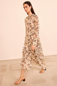 The Rhea Dress is crafted from floaty chiffon that’s alive with palm florals and metallic dots. Featuring a timeless shirt silhouette, this multicolored dress has meticulously pleated ruffles at the collar that continue in spiraling gestures at the skirt. - Metallic fil coupe chiffon - Model Height: 5'10" - Midi length - Round neckline - Long sleeves with button cuffs - Lined - Concealed buttons through front - Composition: 91% silk, 9% metalized polyester - Dry clean only