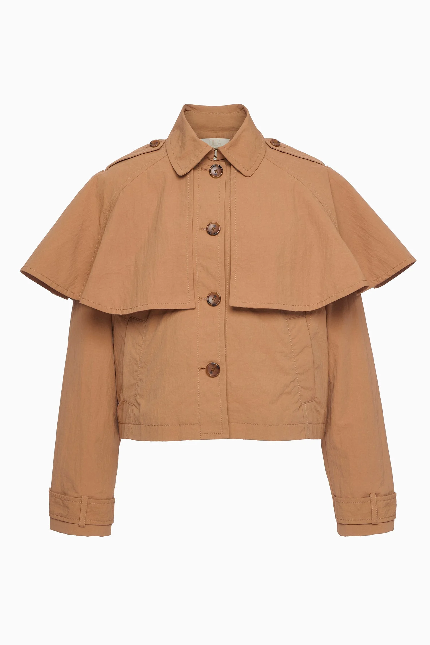 Elegant versatility arrives in the River Jacket, constructed with a removable cape overlay with classic epaulettes. This utilitarian pink jacket is crafted from water-repellent nylon with a crinkled finish and has pockets and adjustable sleeve cuffs. It fastens with sleek buttons through the front. Composition: 100% Polyamide Size & Fit - Model Height: 5'10"