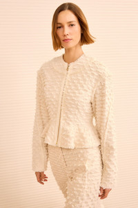 Artfully refined, the Rosalind Jacket is tailored from cotton twill with fil coupe threads that create a fringed checked motif. This textured, white jacket is streamlined and elegant with a collarless neckline and a peplum hem. - Fil coupe cotton twill - Model Height: 5'10" - Designed for a close fit - Collarless - Long sleeves - Zipper through front - Composition: 100% cotton - Dry clean only