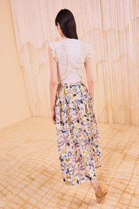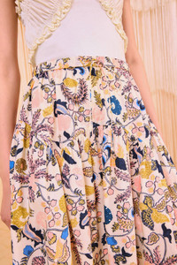 Rendered in signature poplin, the Rosen Skirt features a vintage-inspired print alive with botanicals layered atop a graphic pink backdrop. This summery skirt is structured with light gathering and is designed for effortless wear, with an elastic drawstring waist and side pockets. It easily slips on and has a midi hemline. Composition: 100% Cotton Size & Fit - Model Height: 5'9"