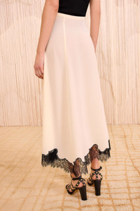 The Rosine Skirt is awash in painterly botanicals printed atop fluid silk crepe de chine. This soft white midi skirt is designed to sit at the high waist, with graceful volume at the hemline adorned with Chantilly lace for a vintage-inspired touch. It fastens with a concealed side zipper. Composition: 100% Silk Size & Fit - Model Height: 5'11"
