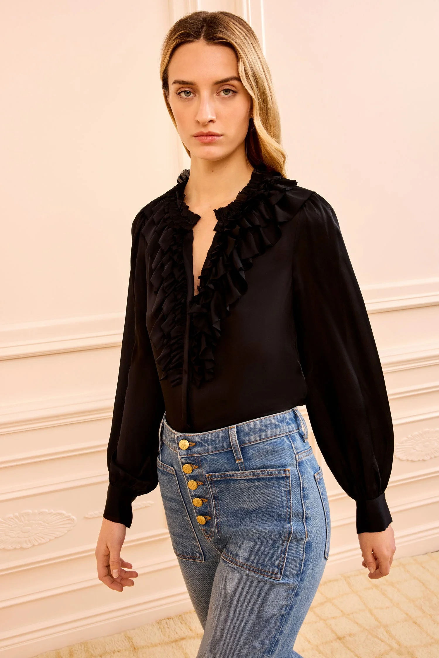 Rouen Silk Ruffle Front Long Sleeve Blou