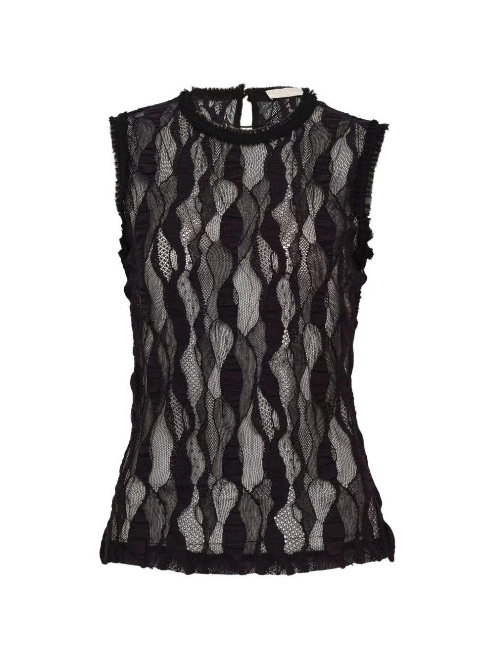 ruffled lace top Highlights - Black - Lace - Ruffled trim - Round neck - Sleeveless - Keyhole at the rear Imported Composition Fabric 100% Washing instructions Read Manufacturer Guidelines