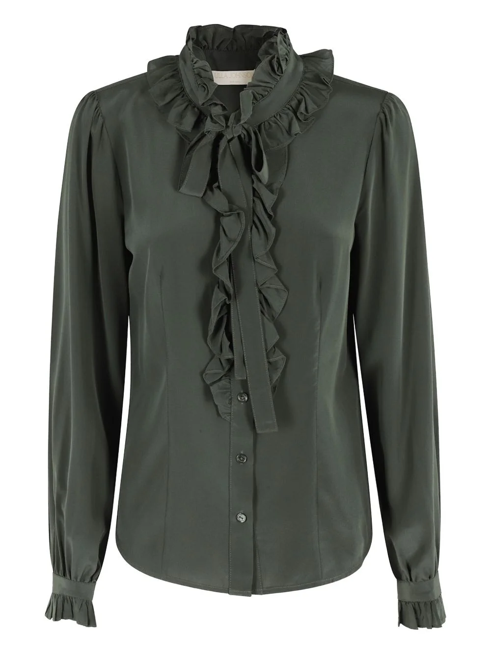 ruffled silk blouse Highlights - Dark green - High neck - Ruffled detailing - Front button fastening - Long sleeves - Ruffled cuffs Imported Composition Silk 100% Washing instructions Read Manufacturer Guidelines