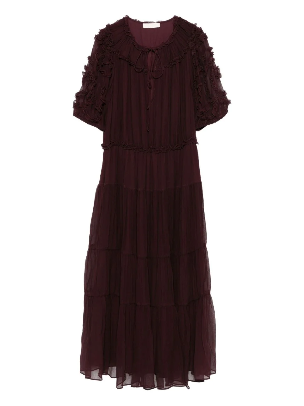 ruffled tiered dress Highlights - Mahogany red - Ruffled neckline - Short sleeves ruffled trim - Tiered skirt - Drawstring neckline - Gathered waist Imported Composition Fabric 100% SIZE & FIT Model measurements Height 5 ft 9 in(1.76 m) Bust/Chest 31.49 in(80 cm) Hips 35.03 in(89 cm) Waist 24.8 in(63 cm) Washing instructions Read Manufacturer Guidelines